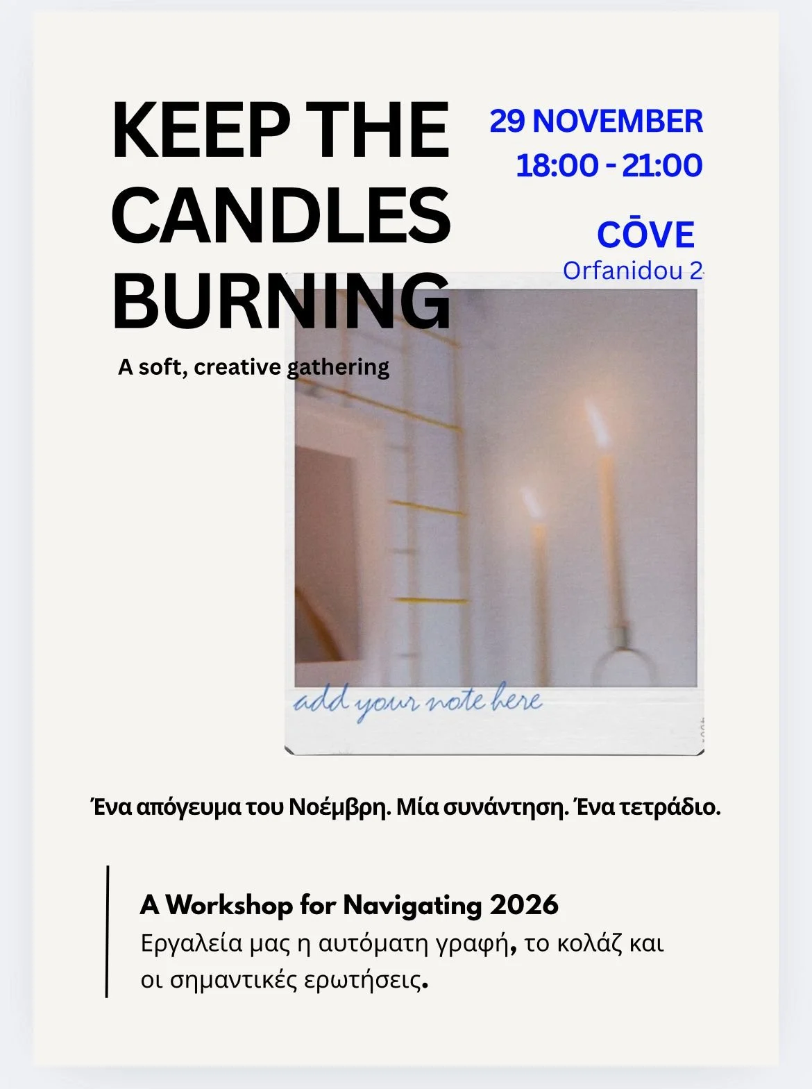 Θα γράψουμε, θα κάνουμε παύσεις, θα αφήσουμε την εικόνα να γεννηθεί από τις λέξεις, χωρίς προσδοκίες και χωρίς ανάγκη να είναι “τέλειο”. Θα δουλέψουμε με ερωτήματα για το 2026, για όσα μας συγκινούν, όσα μας κινητοποιούν, όσα θέλουμε να αφήσουμε πίσω.